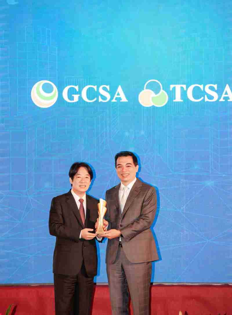达全方位永续表现获全球永续奖及台湾永续奖肯定,,,,由副总统赖清德颁奖 (左),,,,www.z6.com总经理柯富仁 (右) 代表领奖