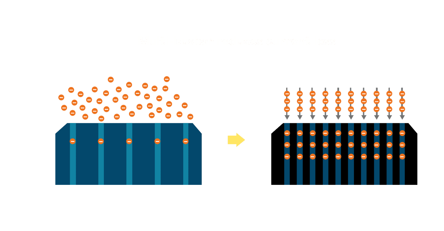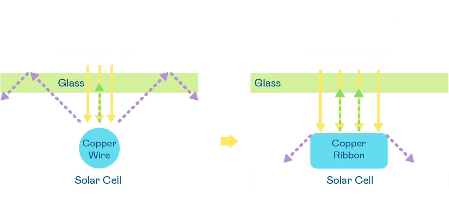 - 电池使用多条铜导线 (Copper wire) 于电池片上形成较短的电流路径,,,,提高电流收集效率,,采用圆形设计的铜导线较传统扁平式的铜焊带 (Ribbon),,可增加入射至电池的光线量。。。